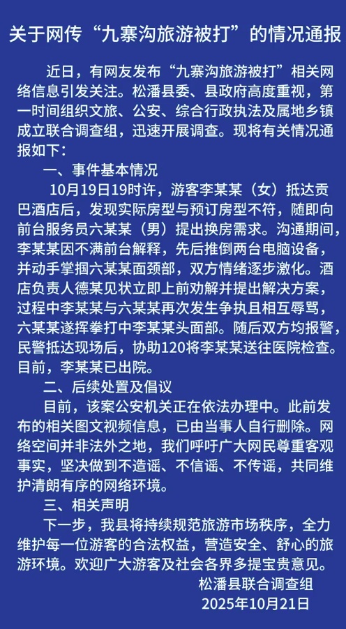 10月21日凌晨,松潘县聚积拜谒组发布《对于网传“九寨沟旅游被打”的情况通报》,全文如下: